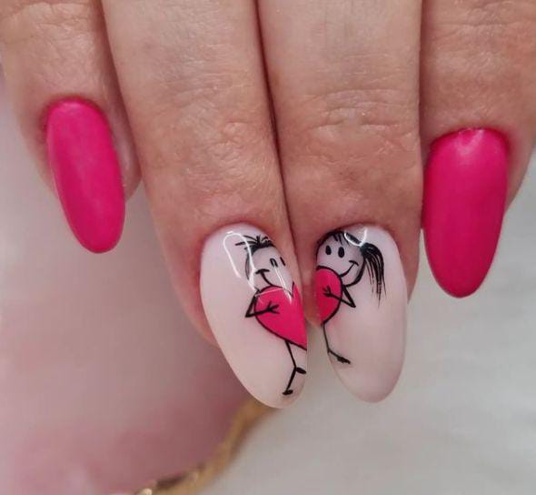 Bright pink nails pair with soft nude almond tips that show an adorable stick-figure couple holding matching hearts, creating a playful and sweet Valentine vibe.