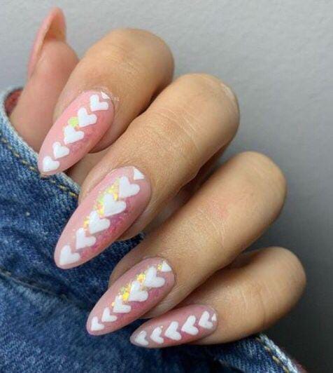 Light pink almond nails are decorated with rows of white hearts and a hint of gold foil, giving the design a dreamy, delicate, and softly romantic Valentine’s look.