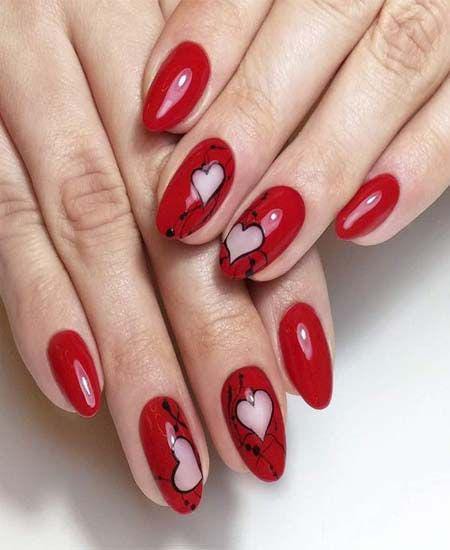 Bright red nails take center stage, with a couple of accent nails featuring large soft-pink hearts outlined in black for a bold but romantic Valentine’s touch.