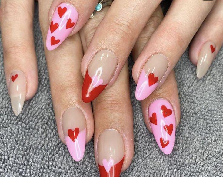 This design mixes nude almond nails with red and pink heart accents, including heart-shaped tips and scattered hearts, creating a fun, modern twist on classic Valentine colors.