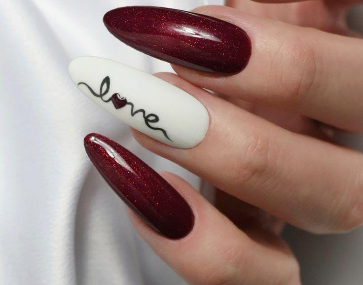 Deep, shimmery burgundy nails paired with a white accent nail featuring a delicate “love” script create an elegant, romantic style. It’s sleek and rich, perfect for anyone who wants a more refined Valentine aesthetic.