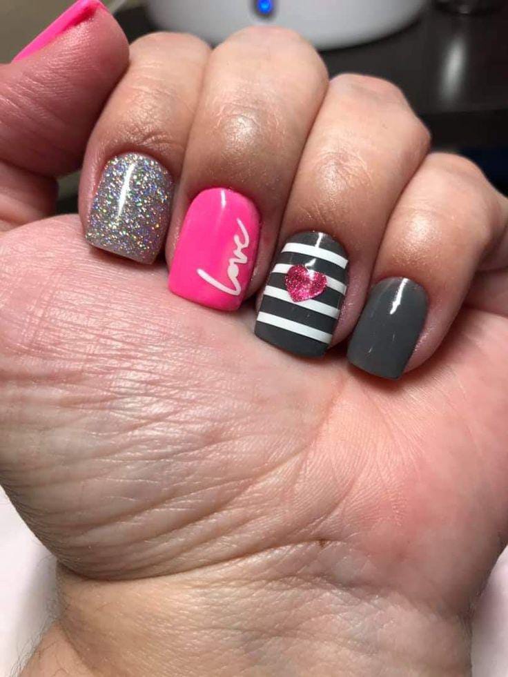 Bright pink nails paired with glittery accents, handwritten “love” details, and striped heart art make this set fun, bold, and full of Valentine personality.
