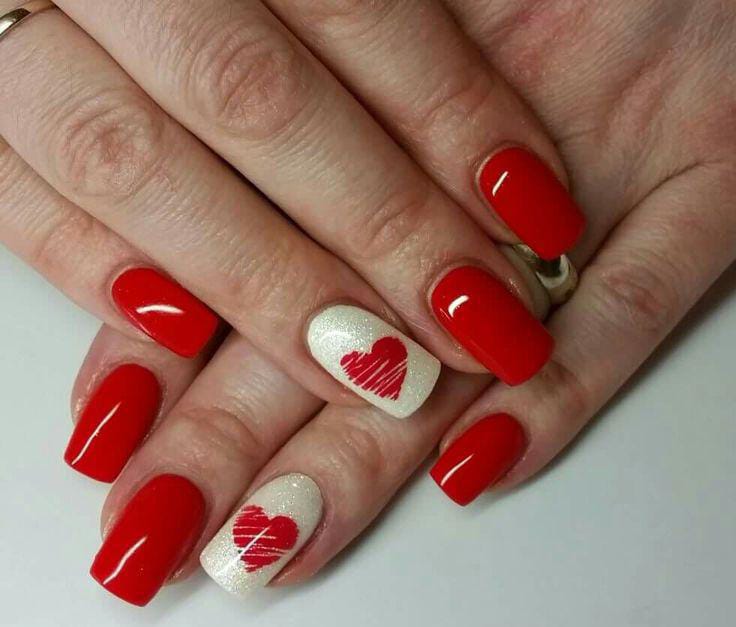 A vibrant red manicure is softened with shimmering white accent nails, each featuring a simple hand-drawn red heart for a timeless Valentine’s feel. It’s classic, elegant, and effortlessly romantic.