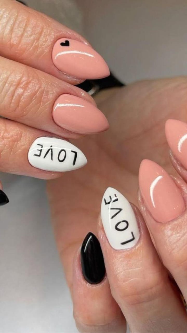 This design blends soft peach nails with simple black accents, paired with crisp white nails that spell out “LOVE” for a clean and modern Valentine’s look.