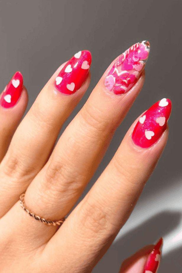 Bright pink nails covered in scattered white and pink hearts create a fun, youthful Valentine’s look. The accent nail with layered heart art adds a playful, romantic touch.