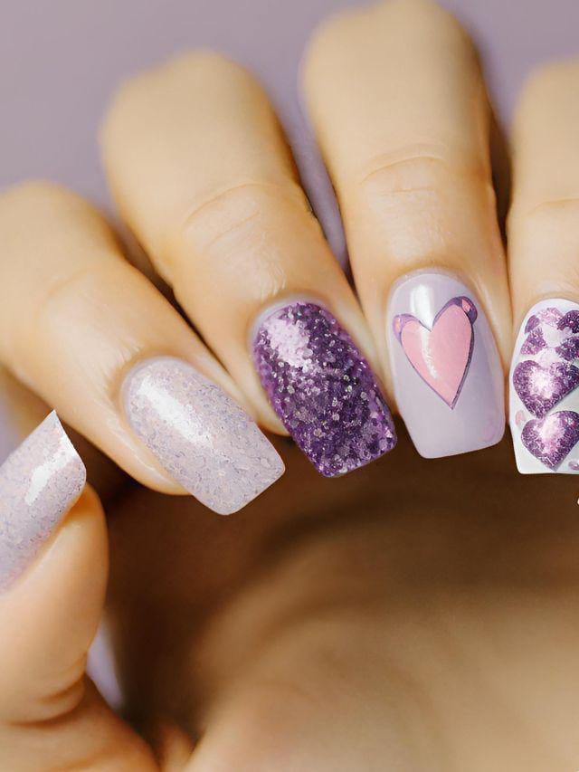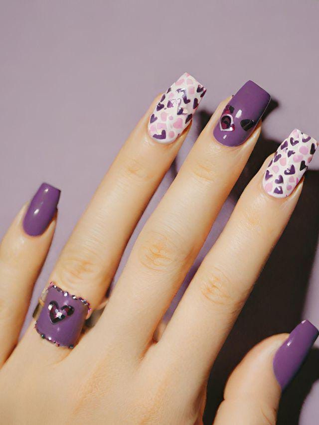 A bold mix of deep purple nails paired with accent nails covered in scattered lilac and plum hearts, giving the whole look a chic, romantic Valentine’s vibe.