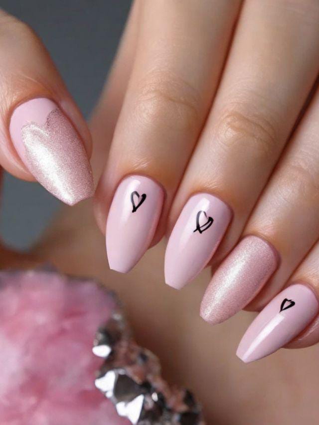 Soft blush pink nails paired with a subtle shimmer and minimalist black heart outlines make this design elegant and feminine. It blends simplicity with a gentle Valentine’s charm.