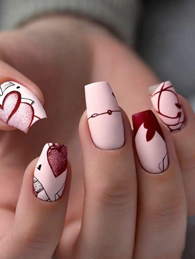 This design features a soft pink base decorated with deep red hearts and abstract line art, giving it a romantic but artsy feel. The mix of matte and subtle glitter adds a modern, hand-drawn Valentine’s charm.