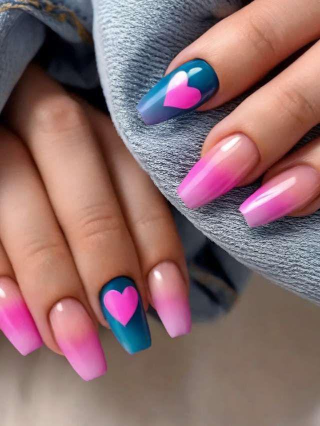 A bright pink ombré blends seamlessly across most nails, paired with a teal accent nail topped with a bold pink heart. It’s playful, colorful, and perfect for a fun, youthful Valentine’s vibe.