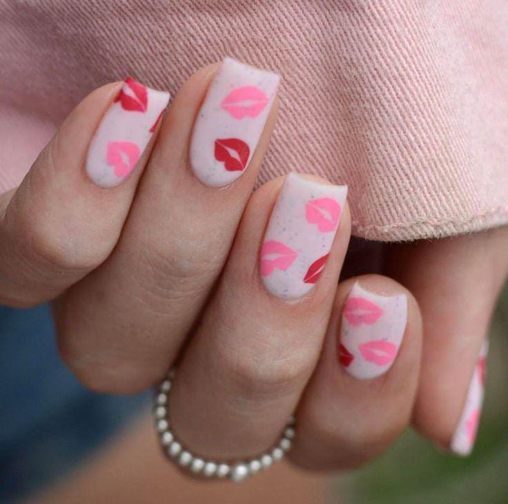Soft pink nails are sprinkled with red and pink lip-print patterns, creating a flirty and cute look. The scattered placement gives it a fun, effortless Valentine’s aesthetic.