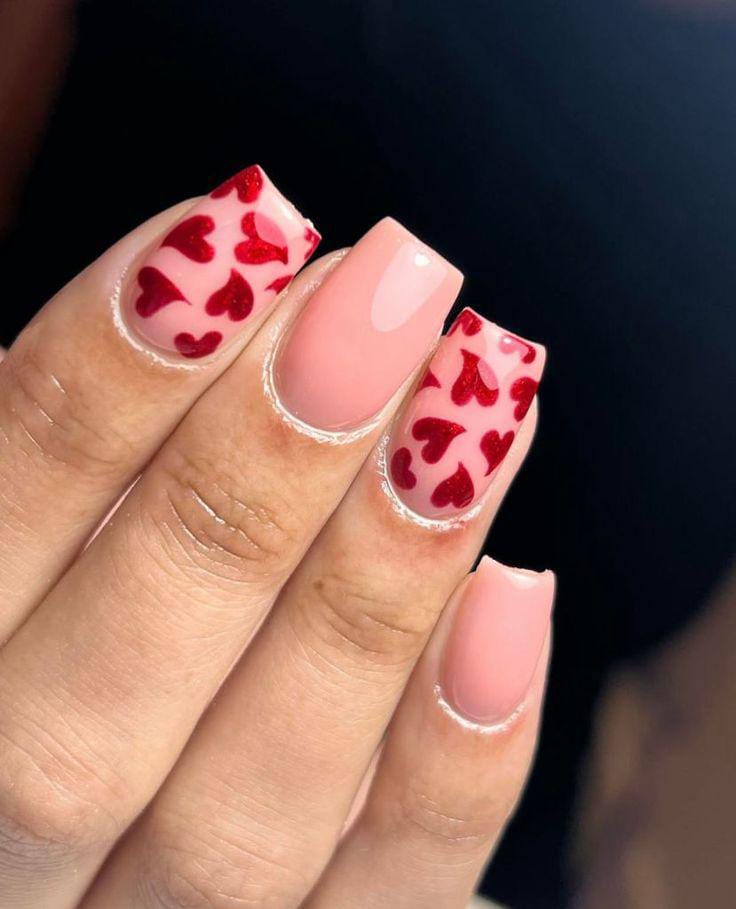 A natural nude base is paired with nails covered in glossy red hearts, keeping the look simple but striking. It’s a classic Valentine’s style with a clean, romantic finish.