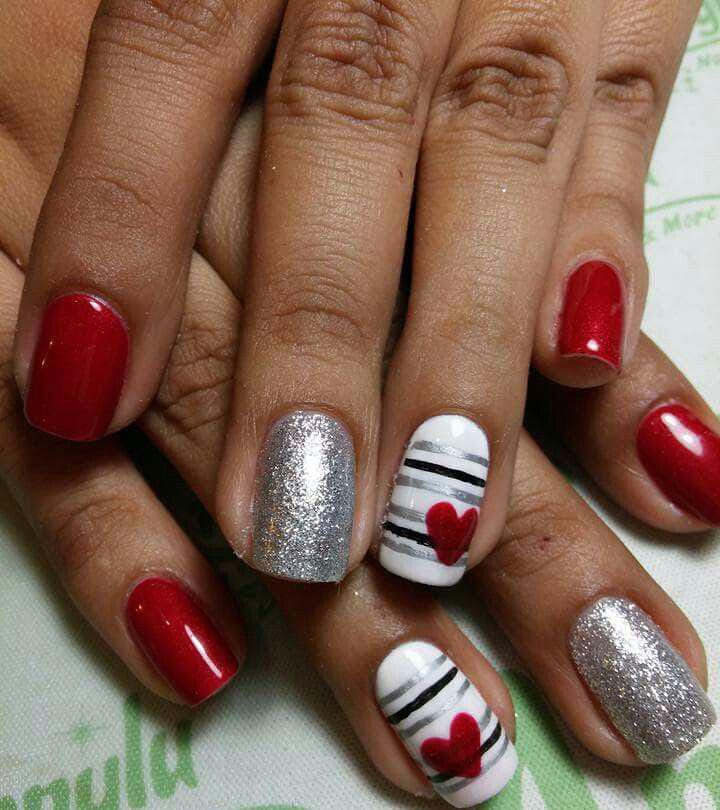 Bold red nails pair with a silver glitter accent and a white striped nail topped with a red heart, giving the whole set a clean yet romantic contrast. It’s classic Valentine’s colors with a modern twist.