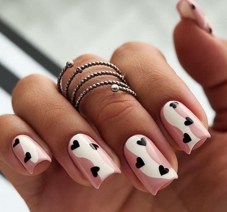 These nails combine soft pink and white wavy patterns accented with tiny black hearts for a chic, modern twist on Valentine’s themes. The contrast of colors gives it a stylish and slightly edgy feel.