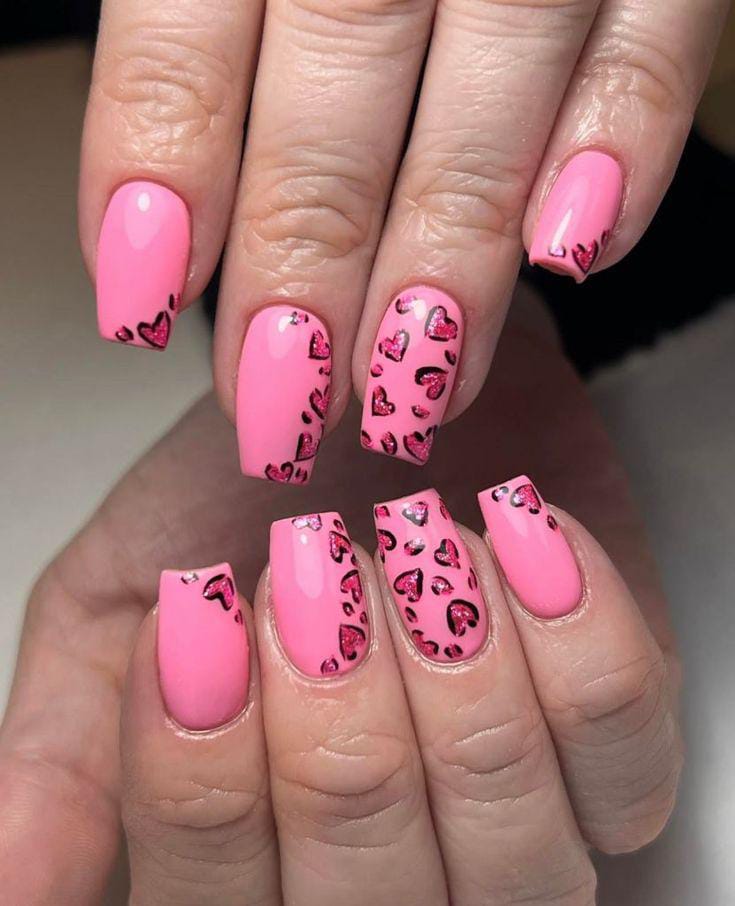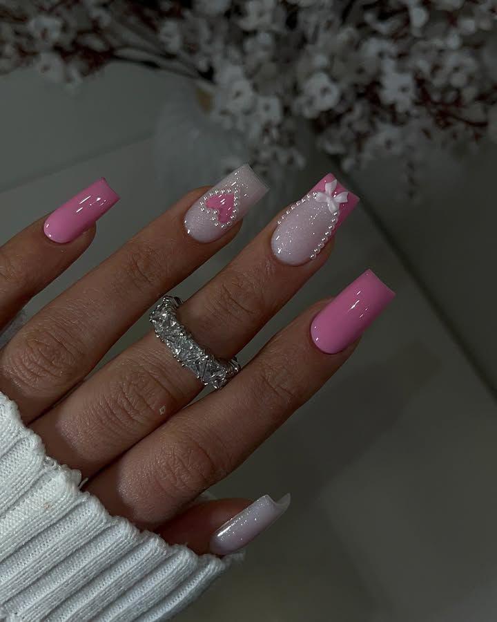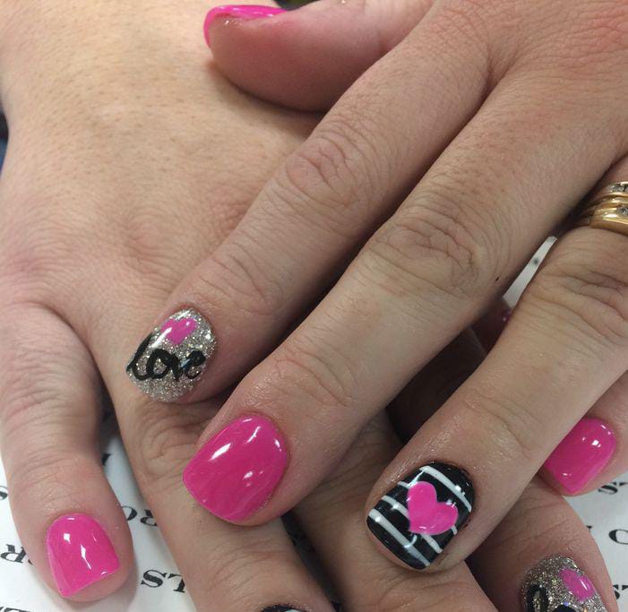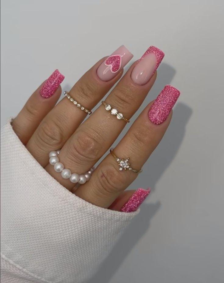 Bright pink nails are paired with glittery heart-filled accent nails, creating a fun, flirty Valentine’s look with a touch of sparkle.