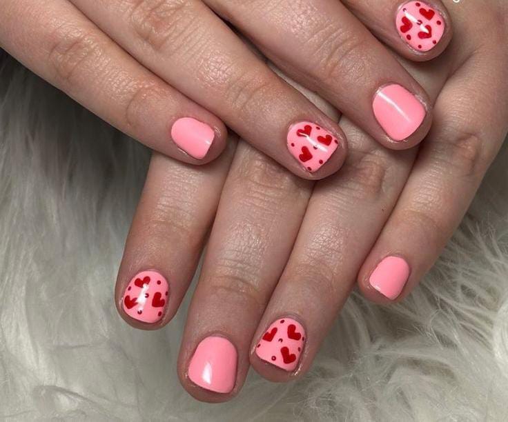 Soft pink nails get a cute upgrade with tiny red hearts on select fingers, giving a simple, sweet, and youthful Valentine’s feel.