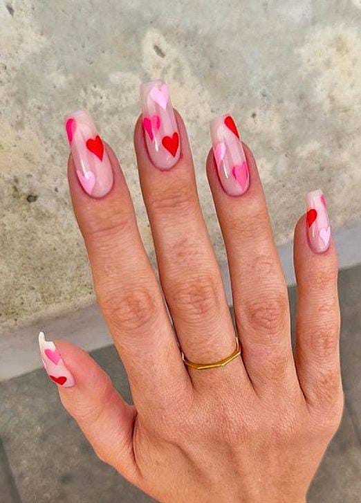 Translucent nude nails are topped with overlapping pink and red hearts, creating a soft, modern, and romantic layered effect perfect for Valentine’s Day.