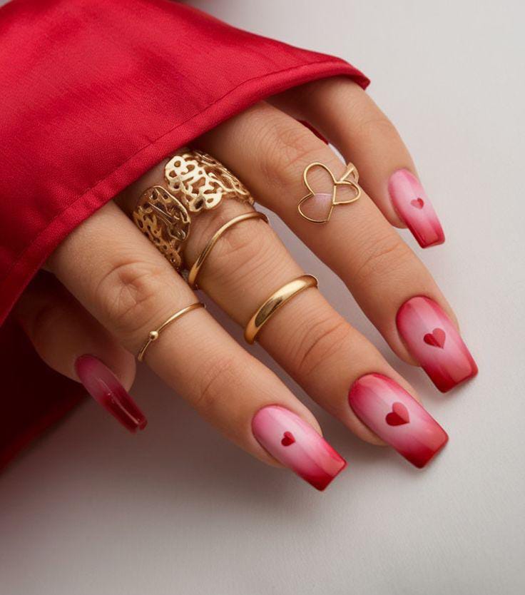 This design features a soft pink-to-red ombre base with a tiny red heart centered on each nail, giving it a romantic and elegant Valentine’s glow. The long square shape adds a modern, polished finish.