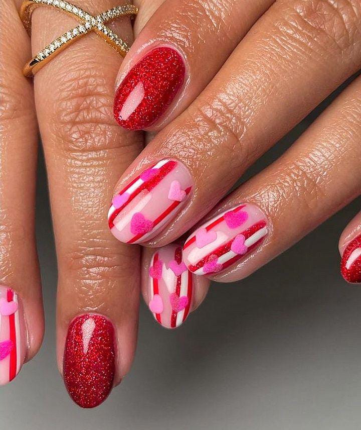 A playful mix of glittery red nails and pink-and-red striped accents covered in mini hearts creates a fun, candy-inspired Valentine’s theme. It’s bright, bold, and full of cheerful charm.
