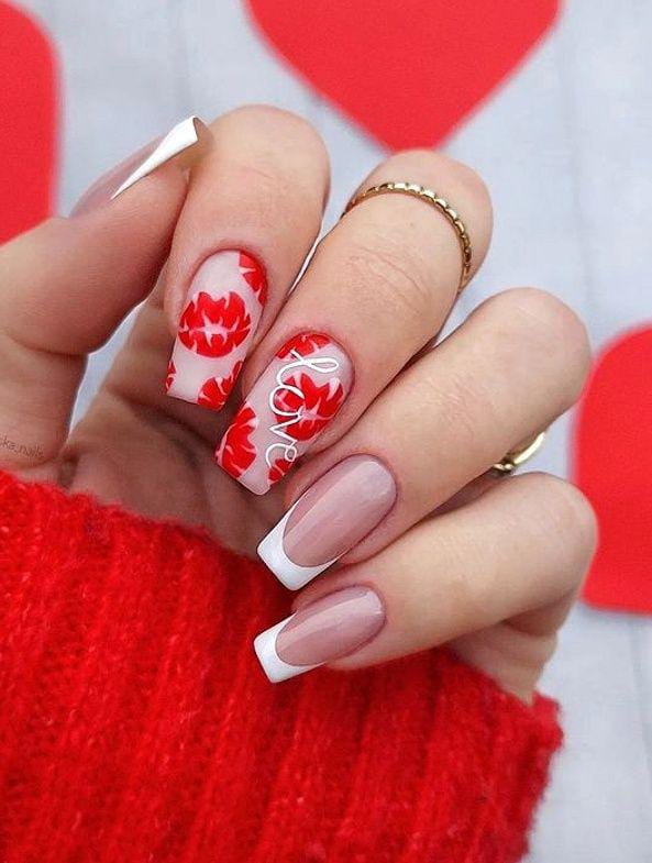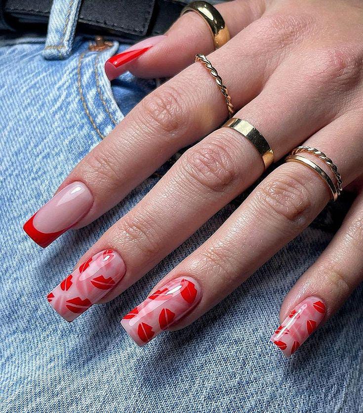 A nude-pink base sets the stage for bright red French tips and playful red lip-print patterns. The overall look is trendy, flirty, and perfect for Valentine’s Day with a bold twist.