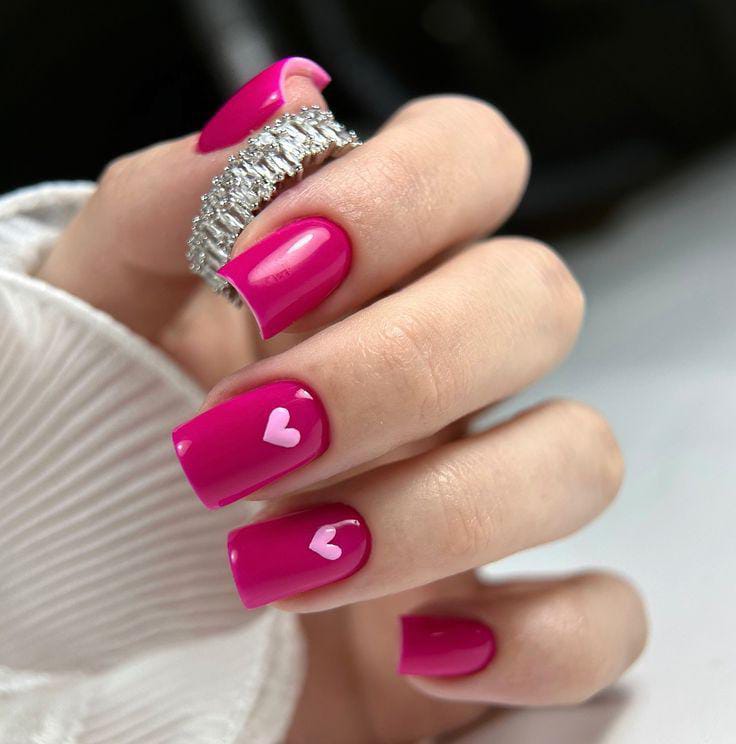 Glossy hot-pink nails with small pastel-pink hearts offer a simple but vibrant Valentine’s look. The design is cute, youthful, and full of bold color.