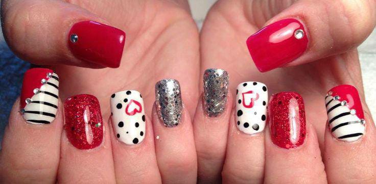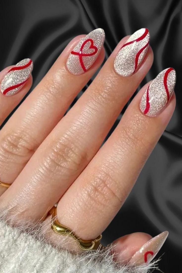 A mix of red, white, and silver glitter nails decorated with polka dots, stripes, and small heart outlines creates a fun, lively Valentine’s look.