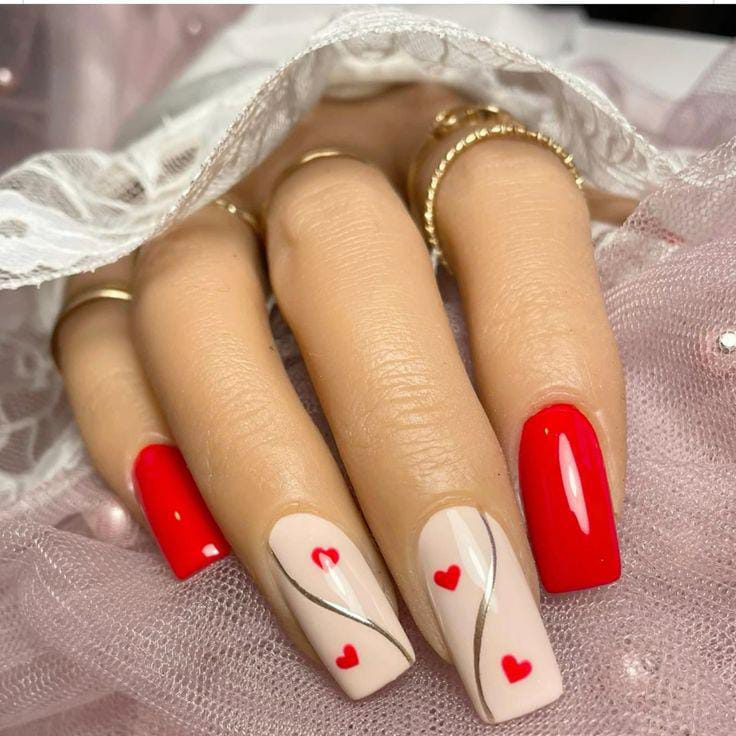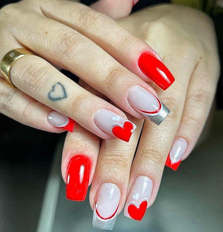 A bold mix of bright red nails paired with soft nude ones, decorated with tiny red hearts and sleek silver lines for a clean, romantic Valentine’s look.
