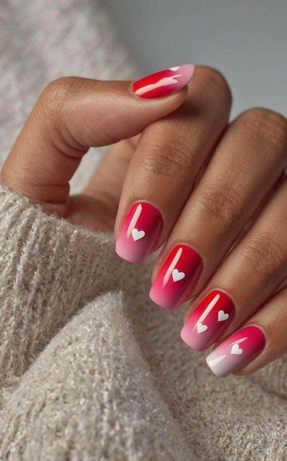 A smooth pink-to-red ombré set topped with small white hearts, giving a soft, dreamy Valentine vibe.