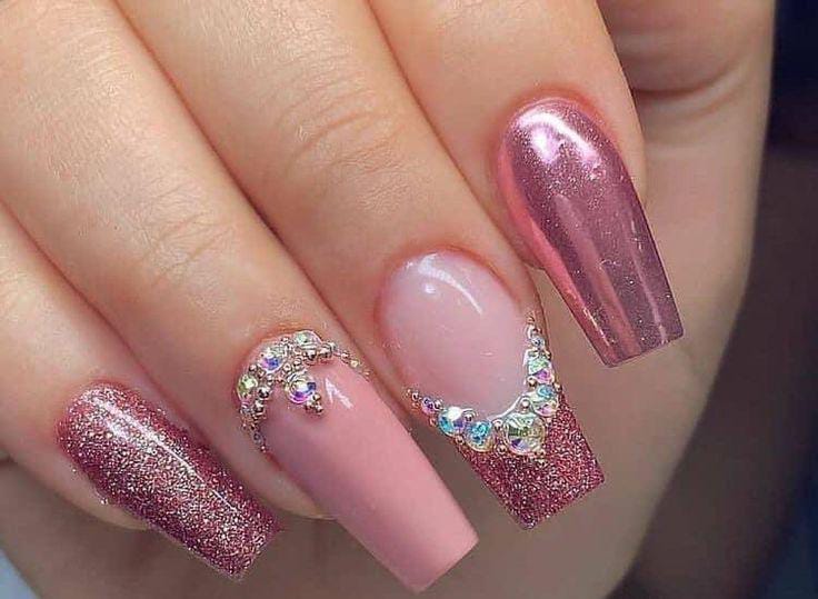 A glamorous blend of rose-gold glitter, chrome shine, and blush pink, featuring crystal embellishments for an elegant, high-end Valentine design.