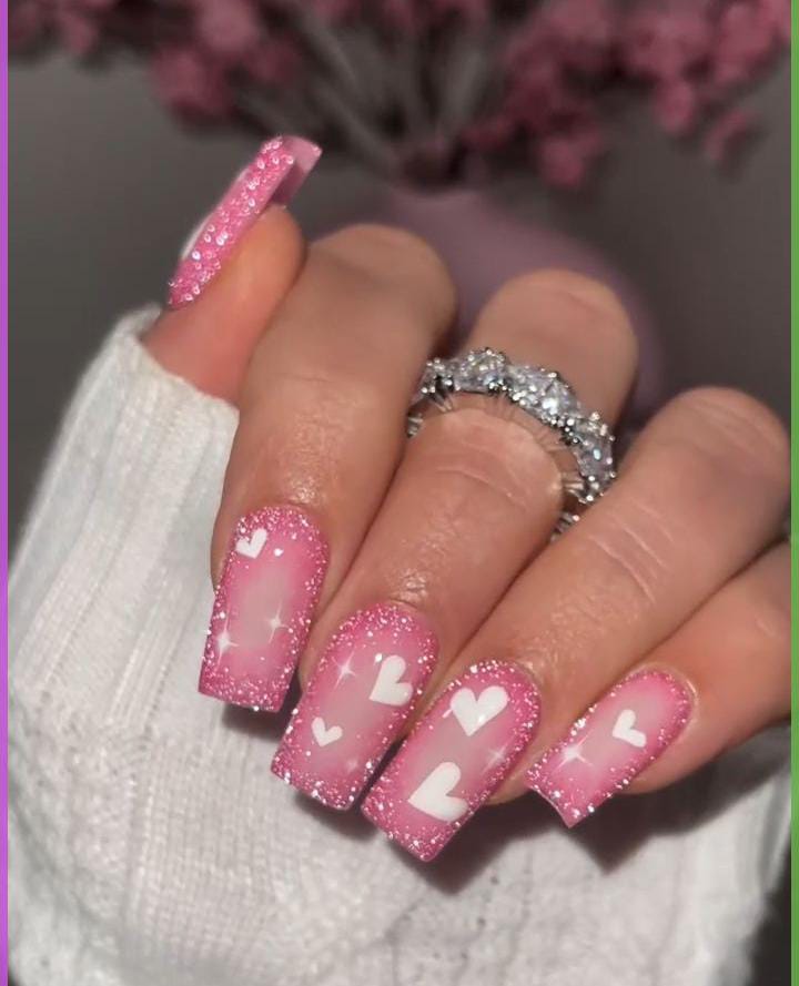 Sparkly pink glitter borders frame a soft blush base with bold white hearts, creating a bright, playful, and eye-catching Valentine look.