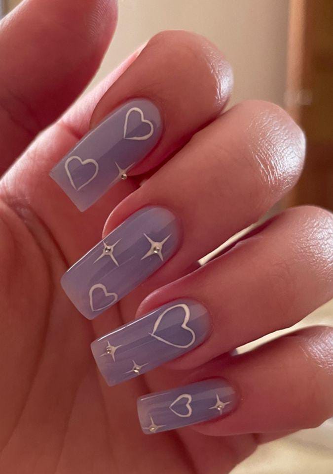 These long lavender nails are decorated with simple white heart outlines and tiny star accents, creating a dreamy, gentle Valentine’s look.