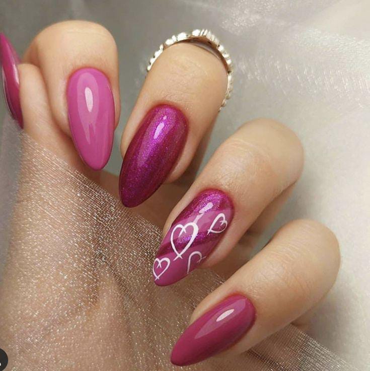 Rich magenta tones with a glossy shimmer are paired with a soft accent nail featuring delicate white heart outlines. The design feels feminine, smooth, and Valentine’s sophisticated.