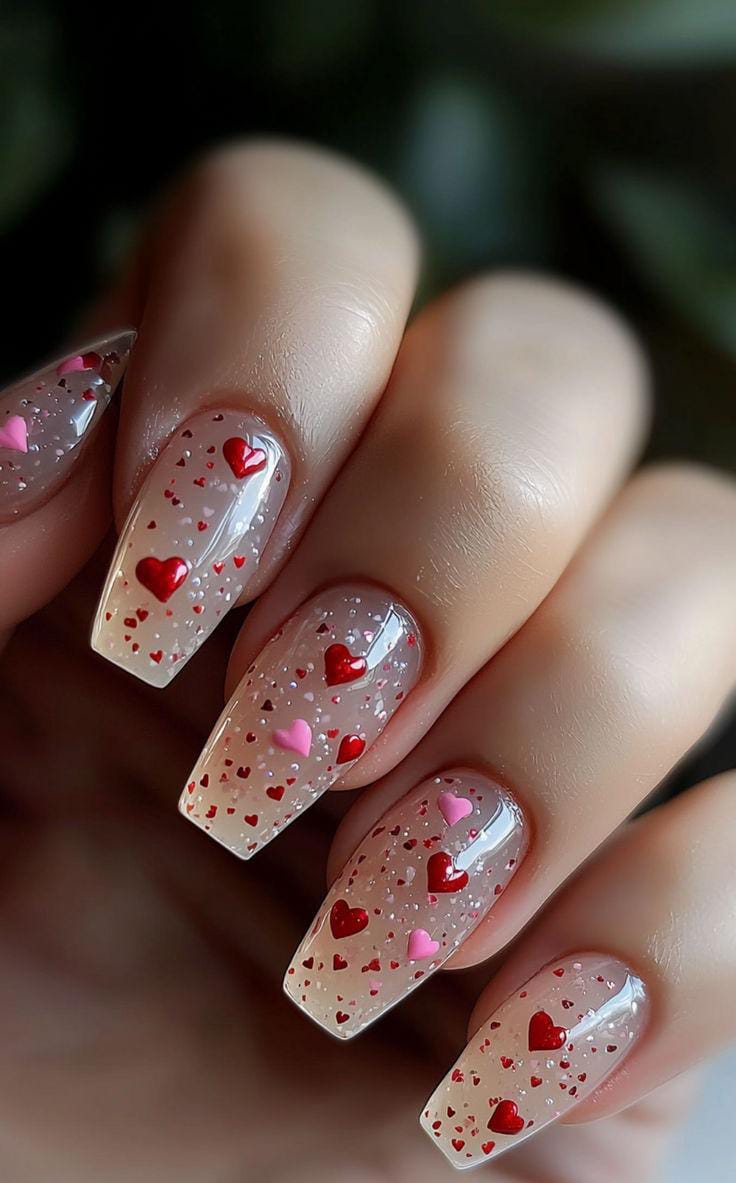 These clear, glittery nails are sprinkled with tiny red and pink heart accents, creating a playful, candy-like look. The scattered hearts give the design a fun and festive Valentine’s vibe.