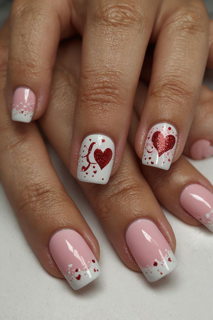 A blend of rose-pink glitter, solid mauve, and crisp white nails creates a fun contrast, highlighted by tiny glitter hearts for a cute, sparkly touch. It gives off a youthful, cheerful Valentine’s vibe.