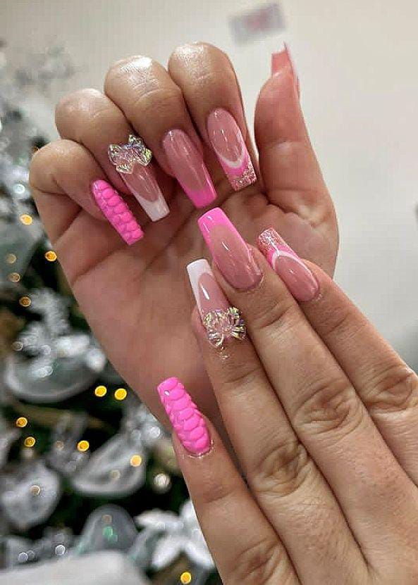 This design mixes bold hot-pink tones with nude bases, 3D textures, marble swirls, and sparkling embellishments, giving a glamorous, eye-catching Valentine’s vibe.