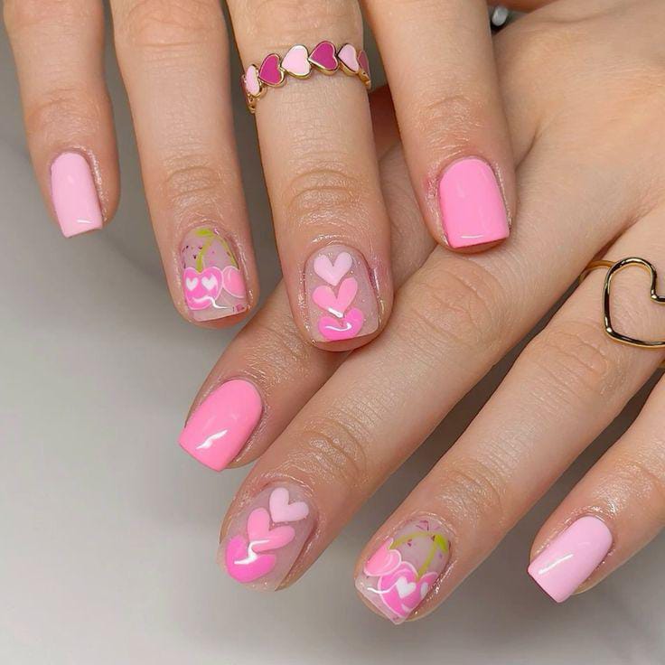 Soft pink polish and layered heart patterns create a sweet, delicate look with a playful, romantic feel perfect for a soft-girl Valentine’s style.