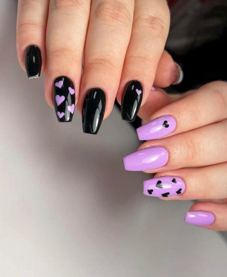 A striking mix of glossy black and lavender tones decorated with tiny hearts gives this design a modern, edgy twist on classic Valentine nails.