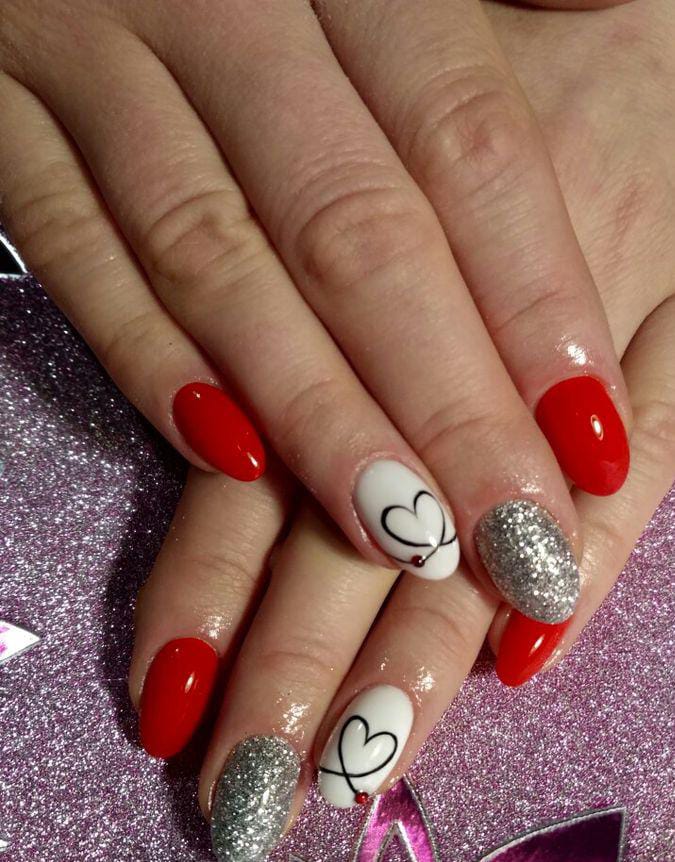 Bright red nails stand out against sparkling silver accents and a white feature nail with simple black heart outlines. It’s a clean, classic Valentine’s combination with a touch of sparkle.
