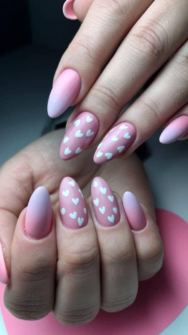 This design features a dreamy pink-to-lavender ombre paired with matte finishes, while a few nails are covered in tiny white hearts for a sweet, romantic feel. It’s soft, playful, and perfect for a gentle Valentine’s Day look.