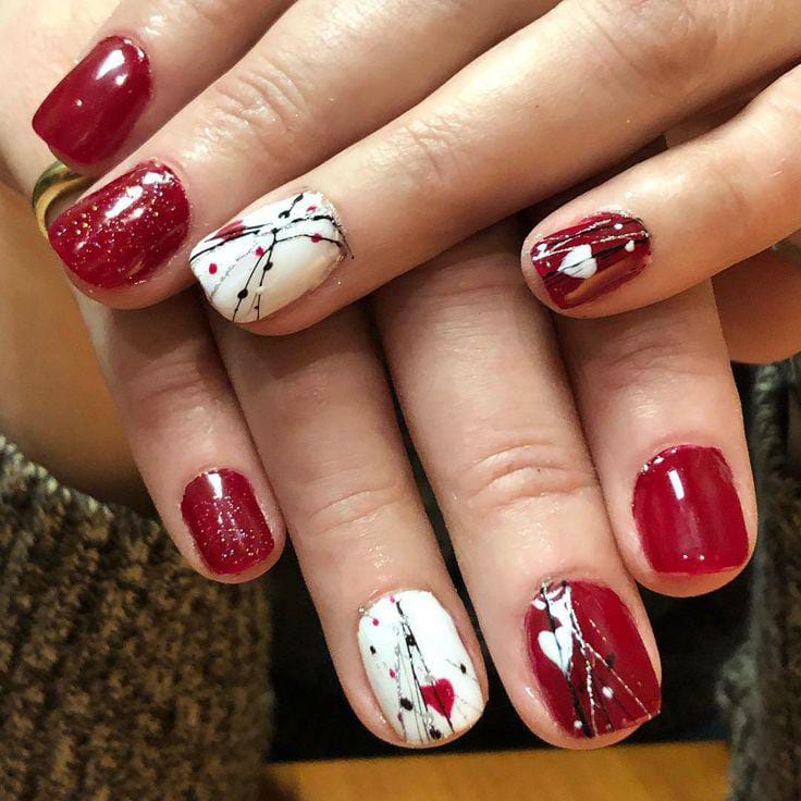Bold red polish is paired with white accent nails decorated with abstract black lines and subtle touches of red, creating an artsy and modern Valentine’s look.