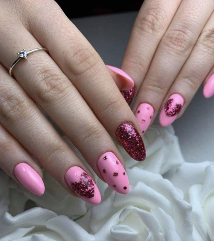 This set mixes glossy pink nails with deep rose glitter and tiny heart-shaped sparkles, creating a bright, festive Valentine’s theme. The blend of shimmer and soft pink makes the design fun and eye-catching.