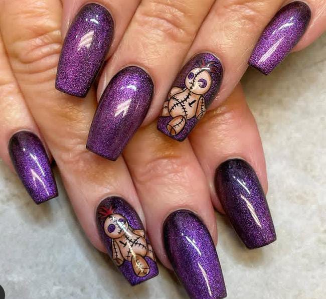 Pastel purple nails filled with cartoon-style voodoo dolls, threads, and pins, offering a fun and quirky twist.