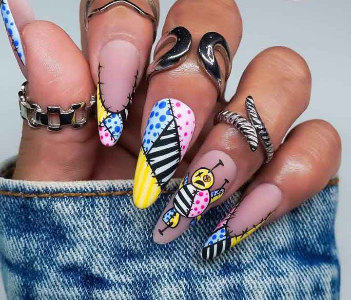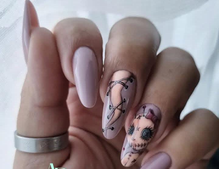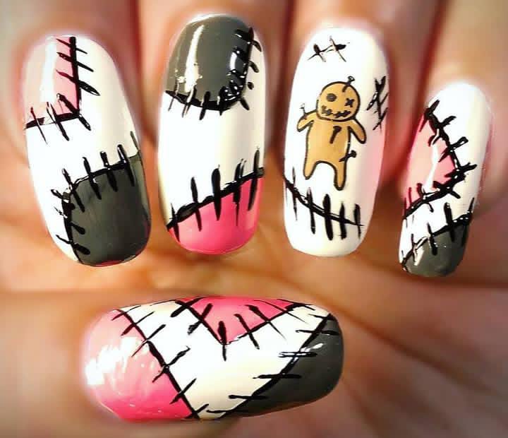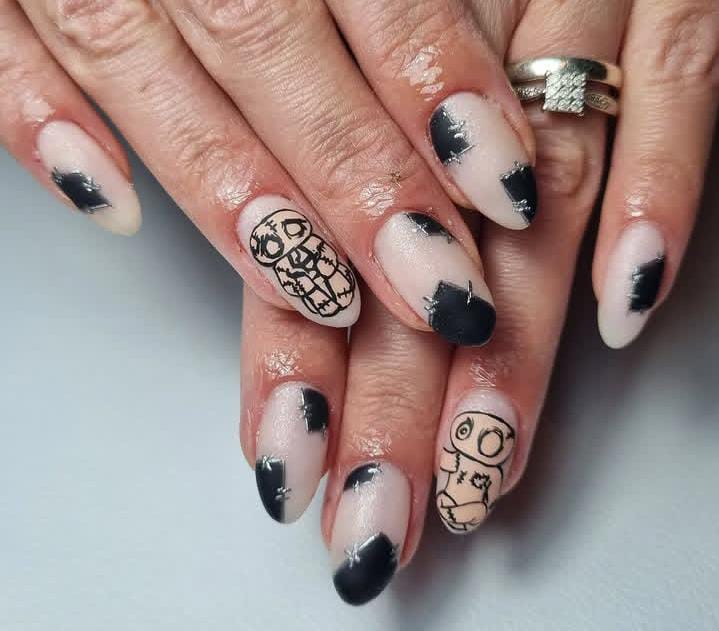 Nude nails with black patches and sketch-style voodoo dolls create a raw, edgy stitched effect.