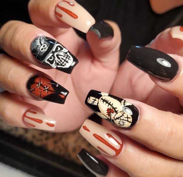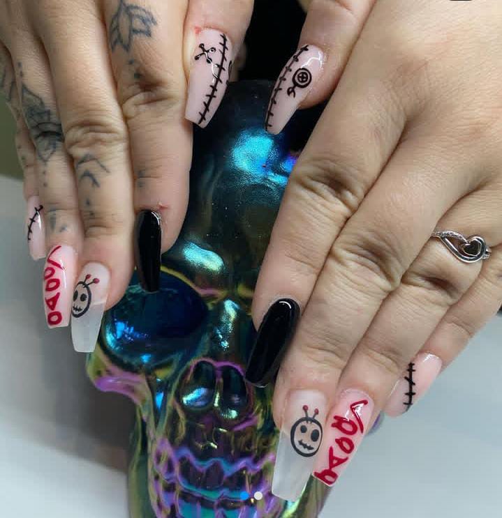 A mix of nude and black nails with stitched patterns, smiley voodoo faces, and bold red “voodoo” text for a spooky, edgy vibe.