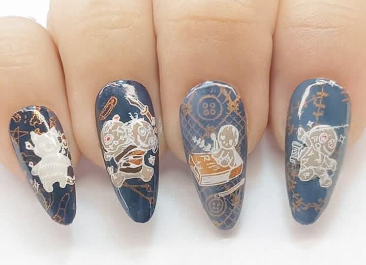 Deep navy nails decorated with intricate white voodoo doll illustrations, buttons, and stitched patterns for a dark mystical feel.