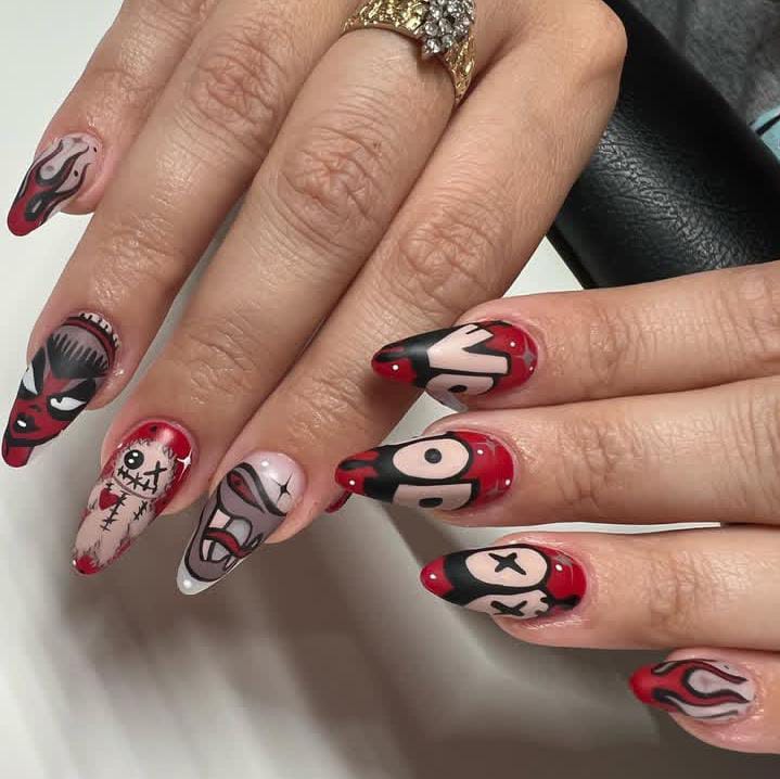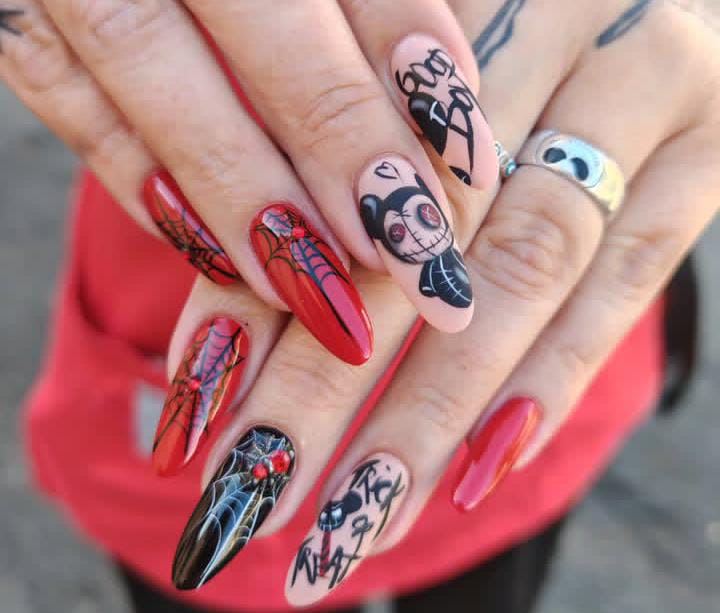 Red and nude nails with spiderwebs, creepy voodoo doll art, and “trick or treat” lettering for a bold Halloween-ready look.