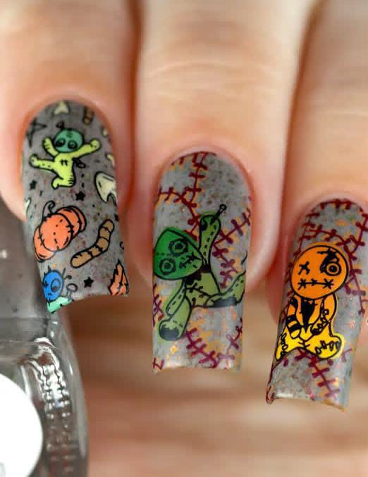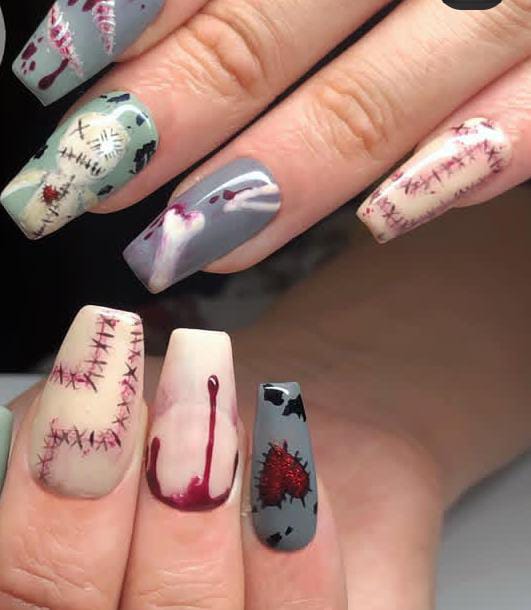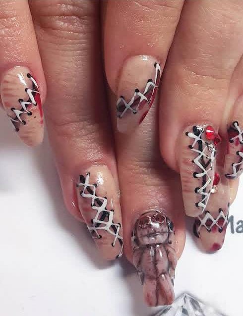 These nails feature a creepy stitched-up look with bloody details, grey, and green, giving off a spooky voodoo doll vibe.