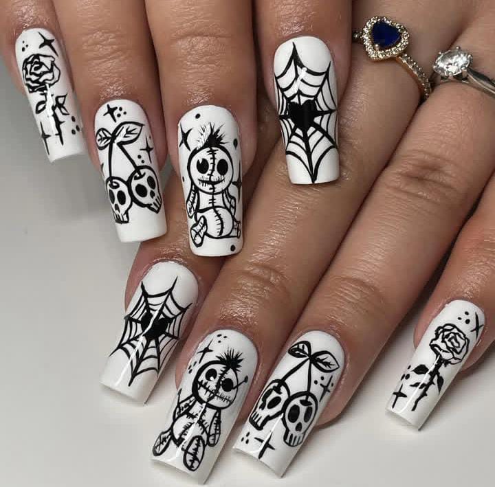 Clean white nails with bold black voodoo dolls, skulls, roses, and spiderwebs for a striking monochrome gothic look.
