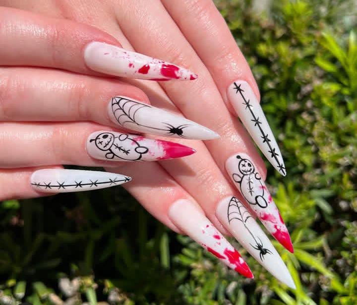 Long stiletto nails with eerie voodoo dolls, spiderwebs, and barbed wire, finished with dramatic blood-red tips.