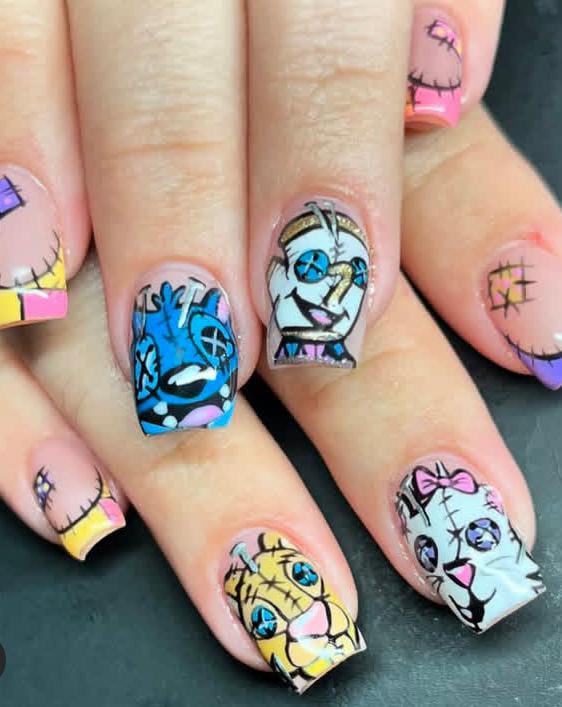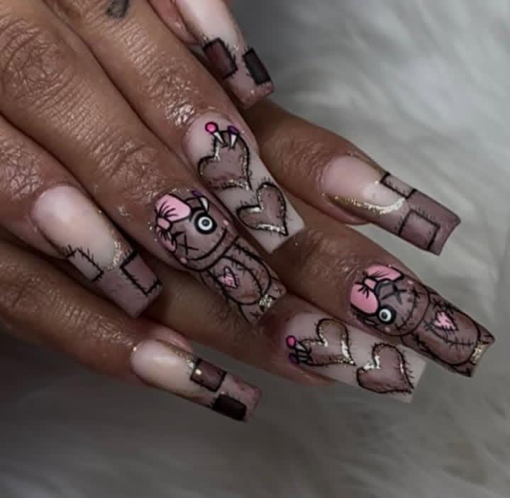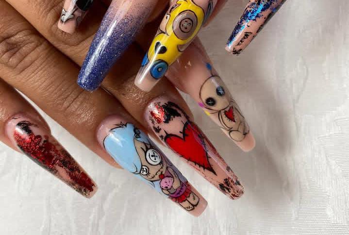 Long coffin nails with colorful cartoon voodoo dolls, stitched hearts, and glitter accents for a playful yet eerie effect.