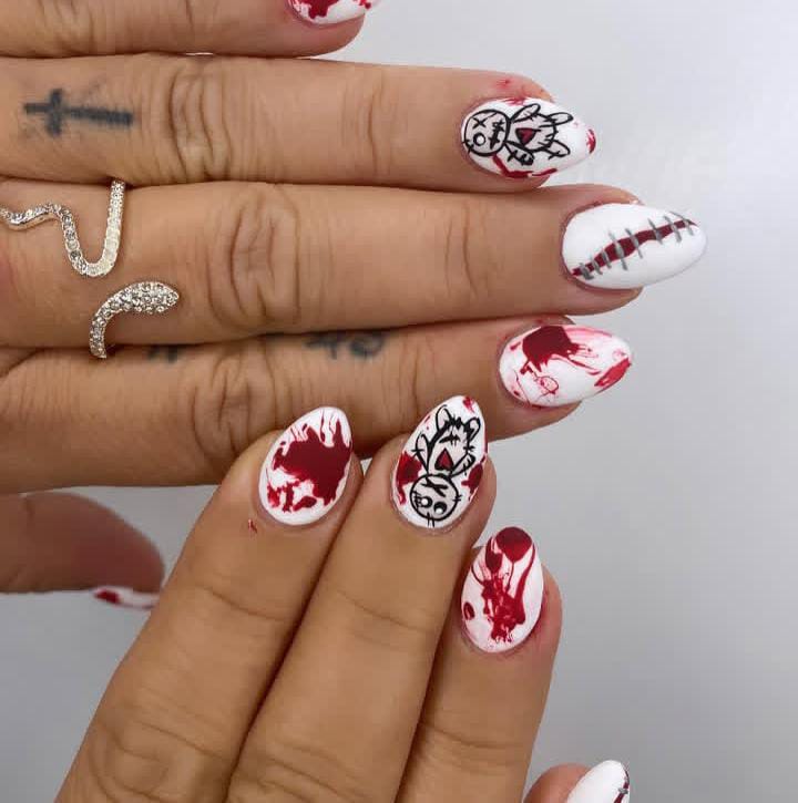 White nails splattered with red and detailed with stitched patterns and creepy tiny voodoo doll art for a chilling, horror-inspired vibe.